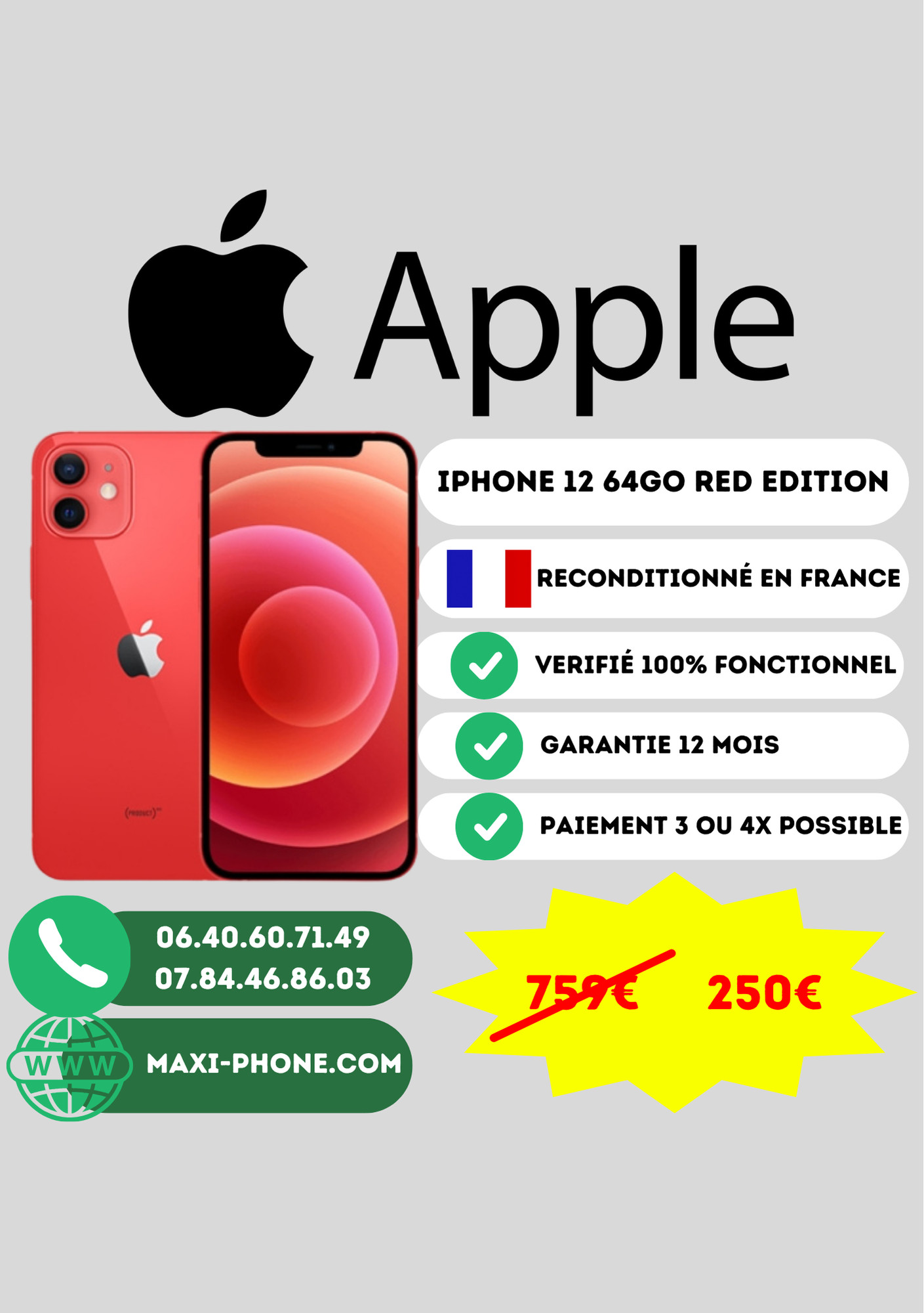 Iphone 12 64Go Rouge reconditionné en France par nos soins