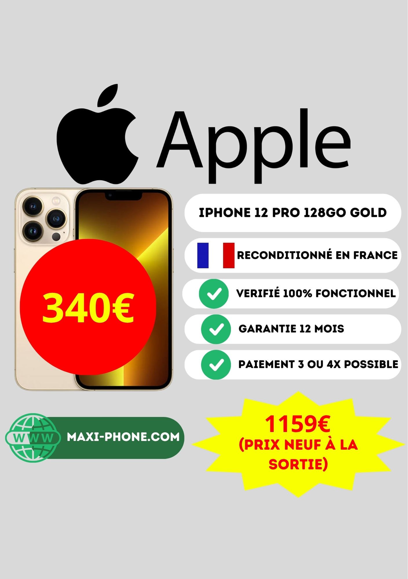 Iphone 12 PRO 128Go Gold reconditionné en France par nos soins