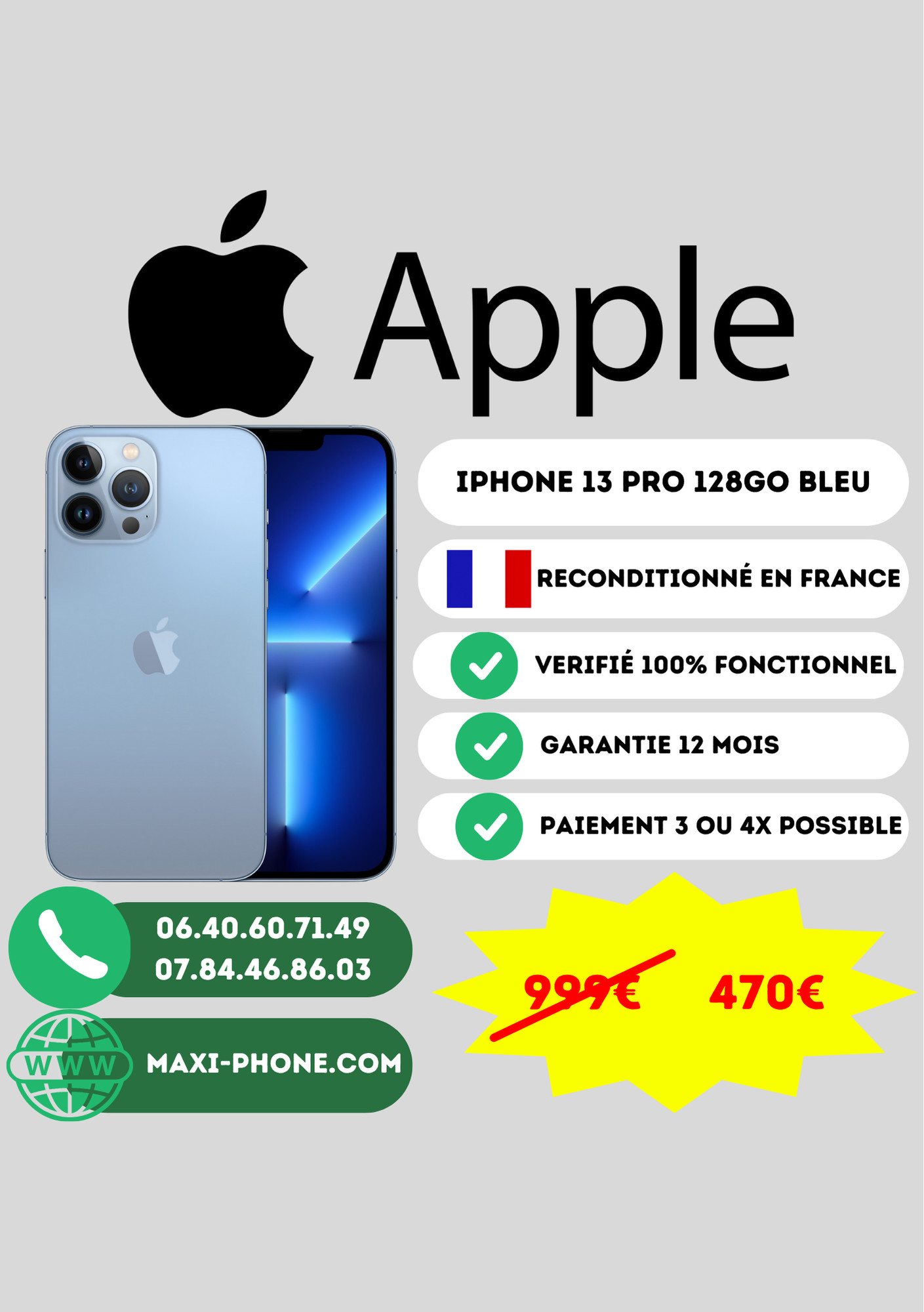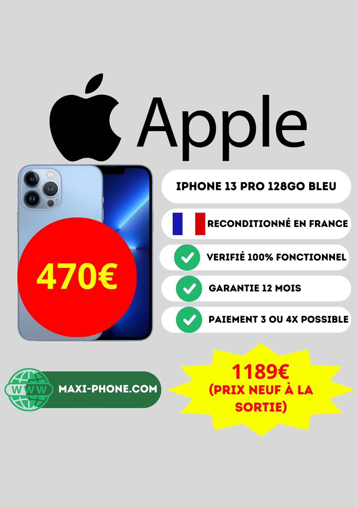 Iphone 13 PRO 128Go Bleu reconditionné en France par nos soins