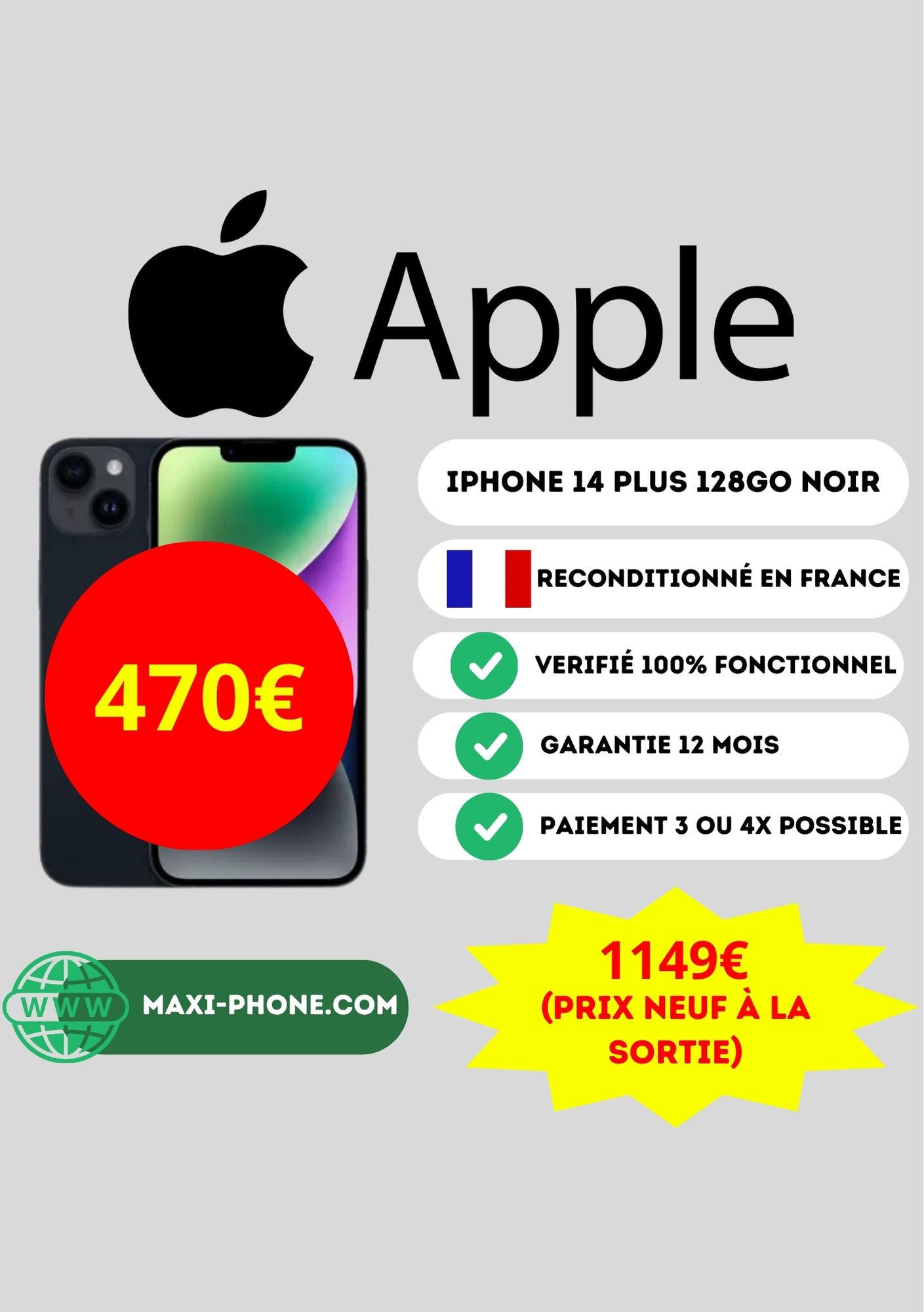 Iphone 14 PLUS 128Go Noir reconditionné en France par nos soins
