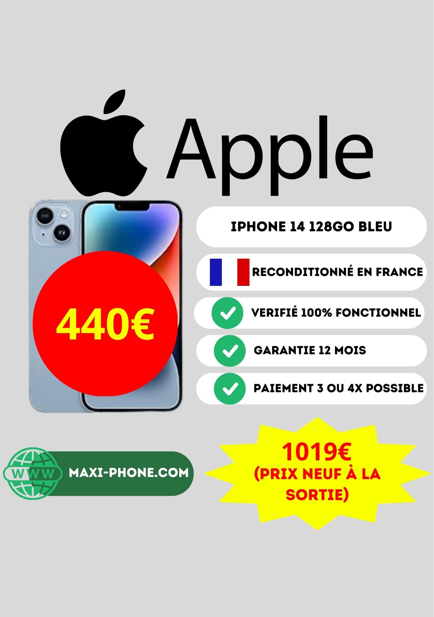 Iphone 14 128Go Bleu reconditionné en France par nos soins