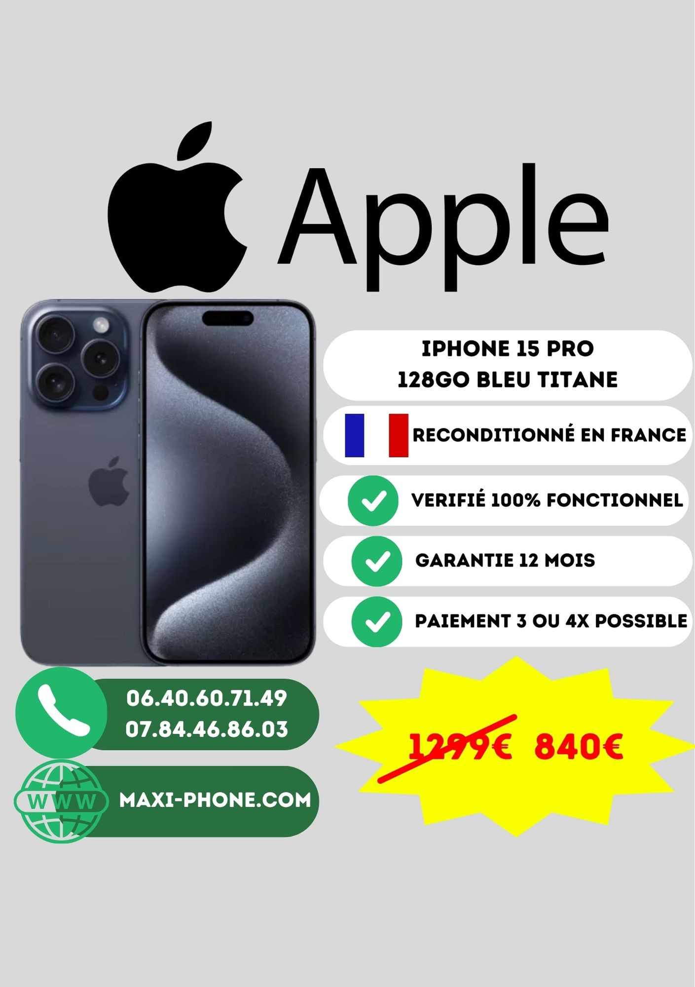Iphone 15 PRO 128Go Bleu Titane reconditionné en France par nos soins