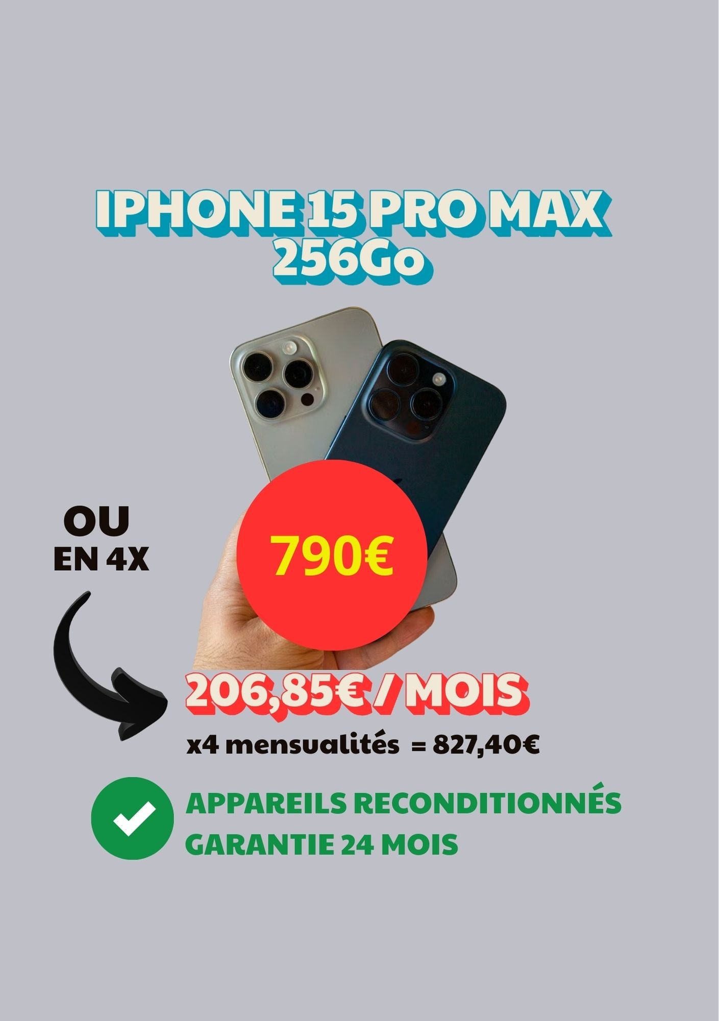 Iphone 15 PRO MAX 256Go reconditionné en France par nos soins