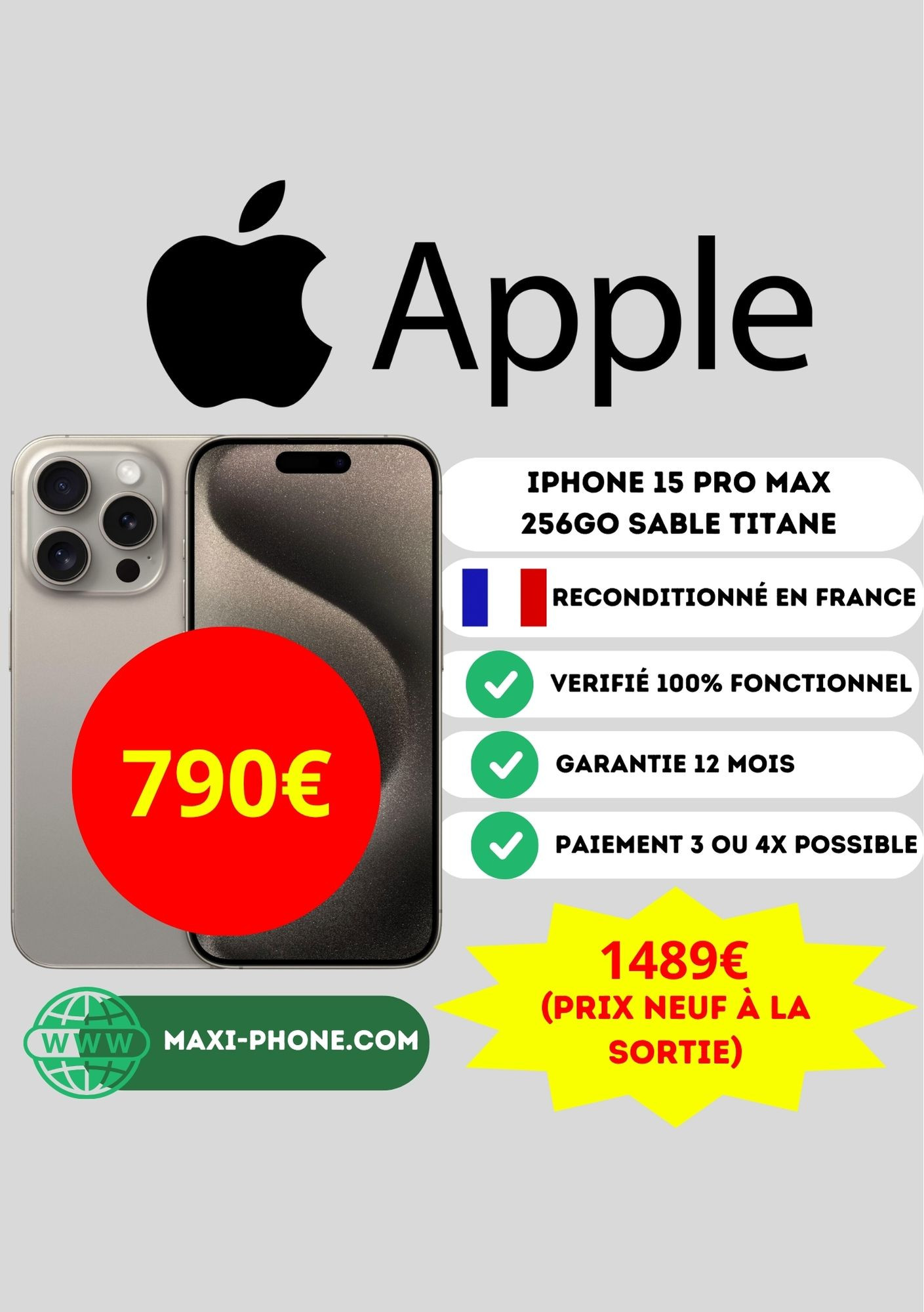 Iphone 15 PRO MAX 256Go Sable reconditionné en France par nos soins