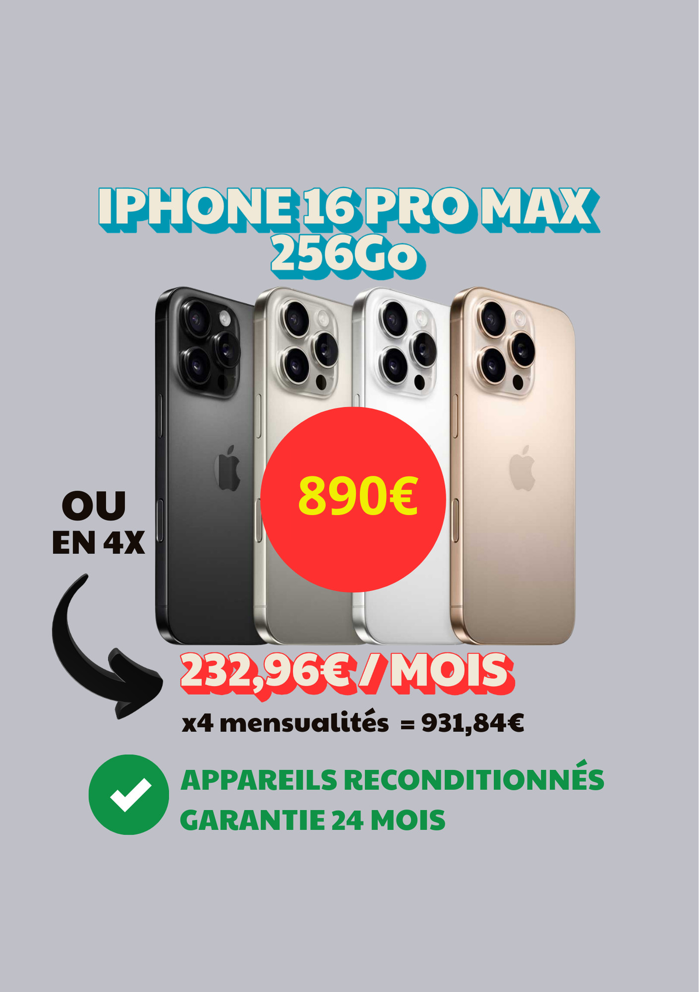 Iphone 16 PRO MAX 256Go reconditionné en France par nos soins