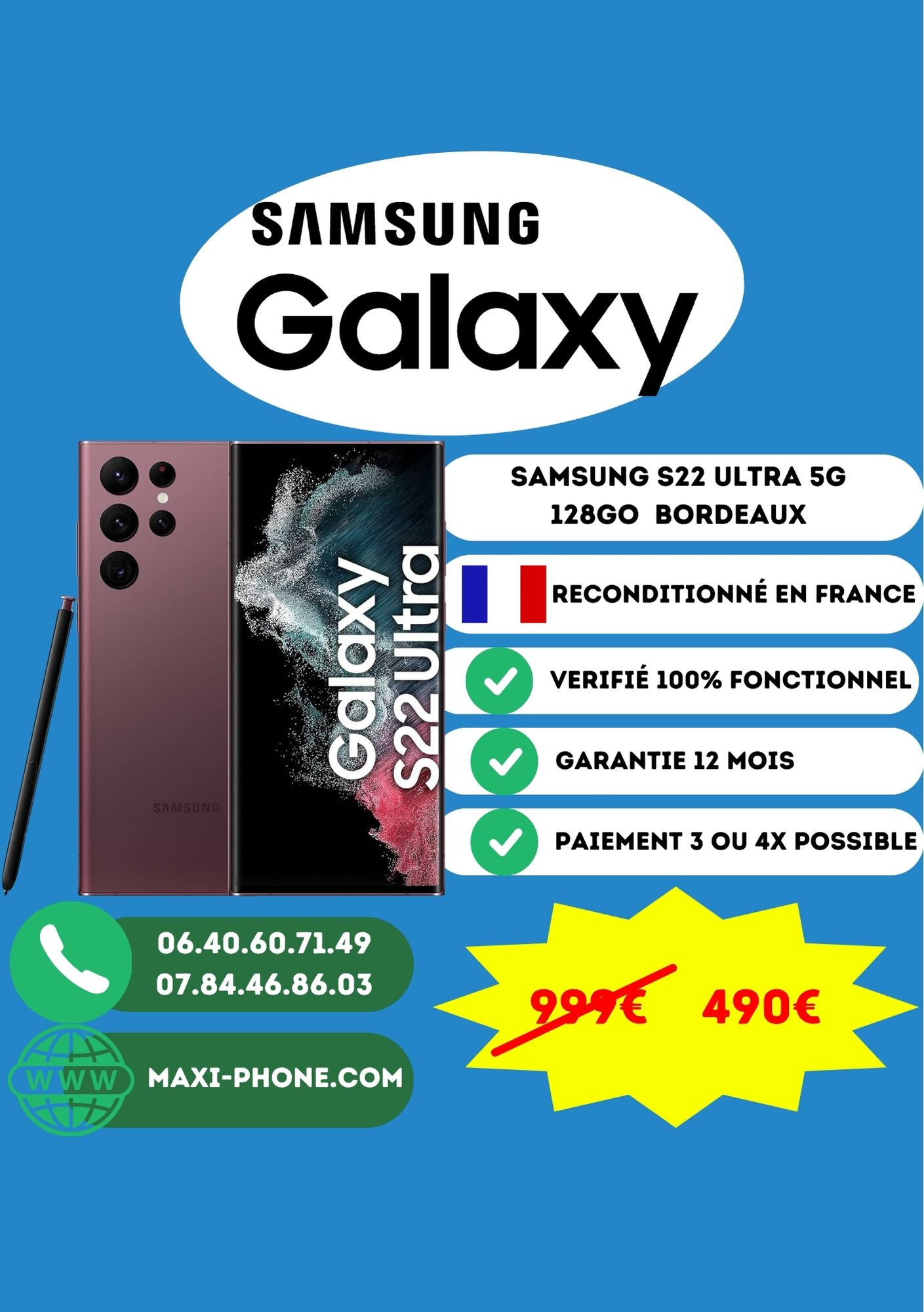 SAMSUNG S22 ULTRA 5G 128Go BORDEAUX GARANTIE 12 MOIS