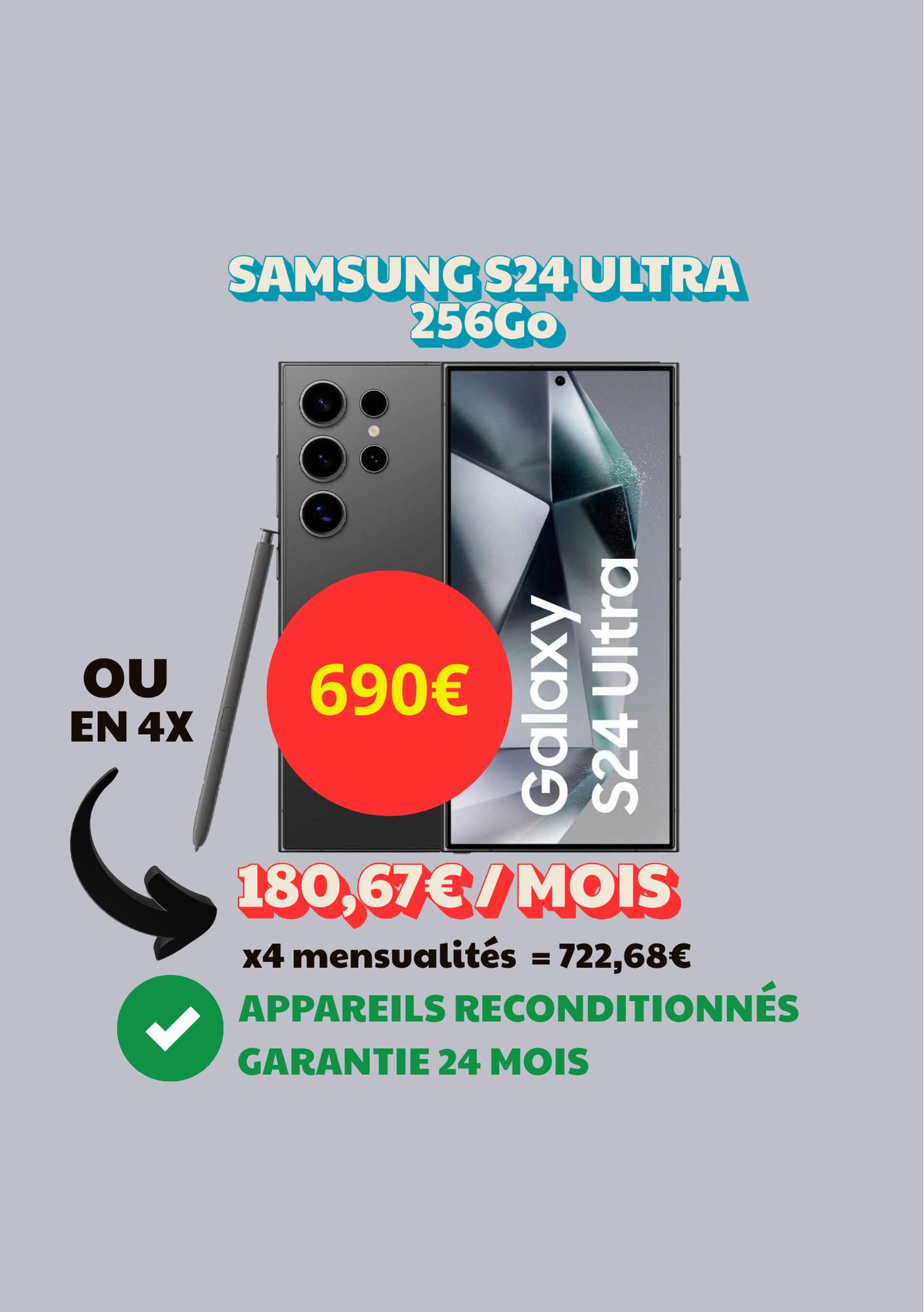 Samsung Galaxy S24 ULTRA 5G 256Go reconditionné en France par nos soins